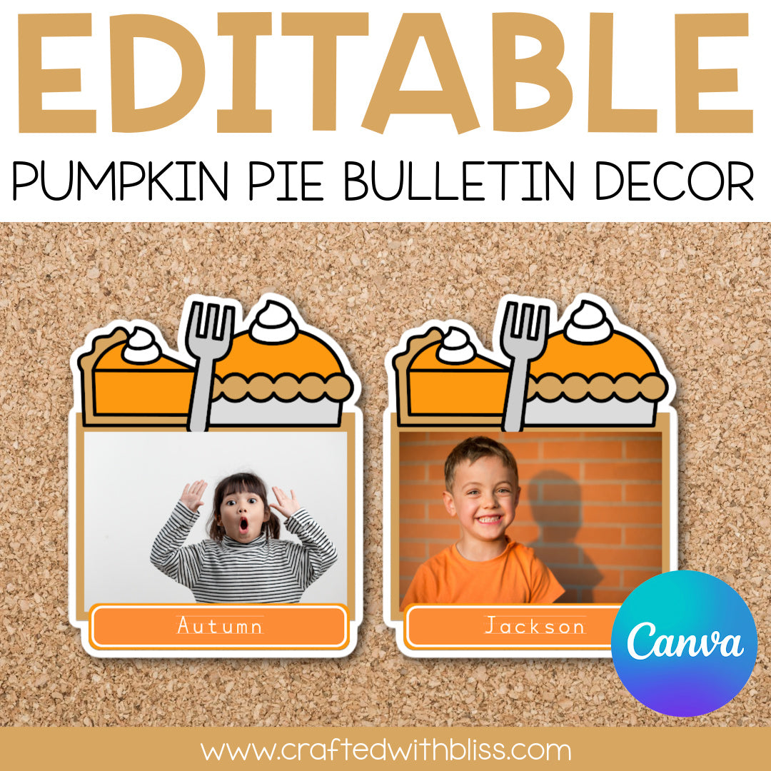 Easily personalize each pumpkin pie slice with student names and photos using Canva, perfect for creating a festive classroom atmosphere!
