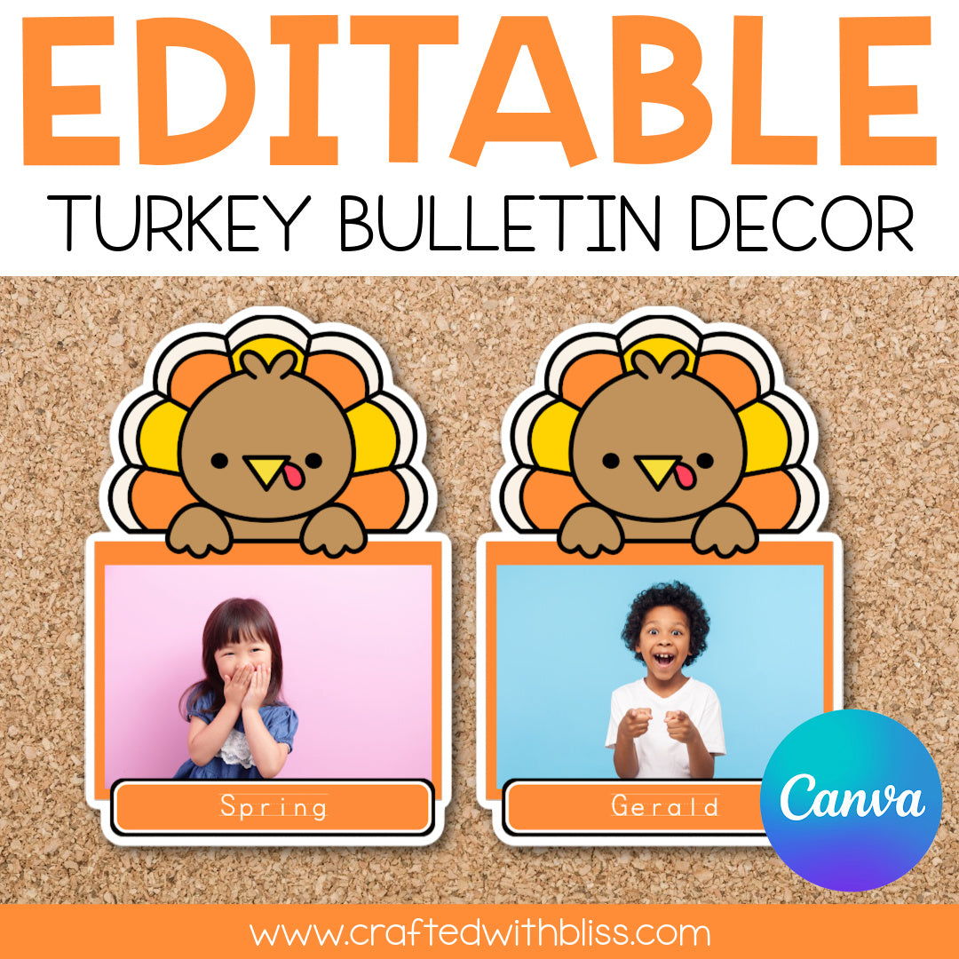 Customize each turkey with student names and photos using Canva, perfect for adding festive flair to your classroom decor!